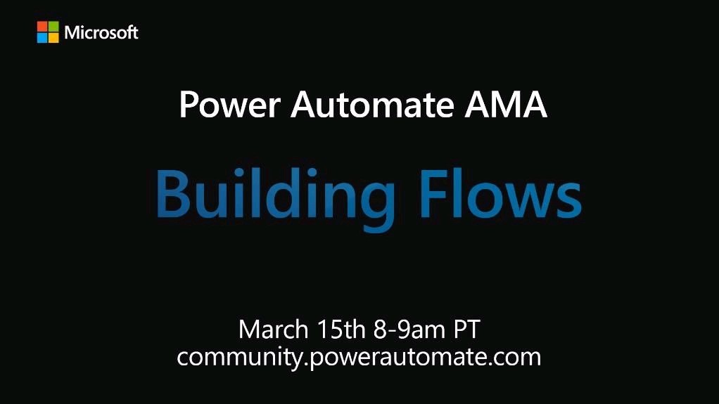 Announcing the March 8th “Building Flows” AMA! Excited to announce our first AMA in the Power Automate community! On March 8th we will be hosting an AMA on “Building Flows”. Come prepared with your questions and we will be answering questions from 8:00AM until 9:00AM Pacific Time. What is an AMA? AMA stands for “Ask Microsoft Anything” – where we gather our Microsoft experts to answer all your experts on the chosen theme. Who will be at the AMA? We’re excited to have Chris Garty, Kishor Subedi, Matt Townsend as our experts from Microsoft to answer community questions.