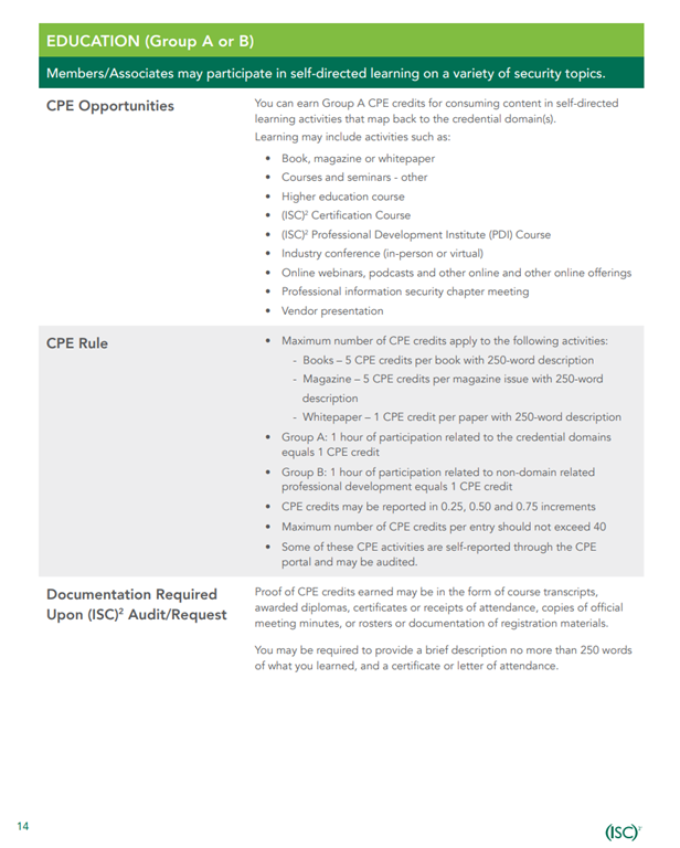 Additionally, for training courses that relate to your ISC certification, according to the “ISC2 Continuing Professional Education (CPE) handbook” page 14, there is a uniform cap of 40 hours per training. Regarding documentation required for ISC2 audits: