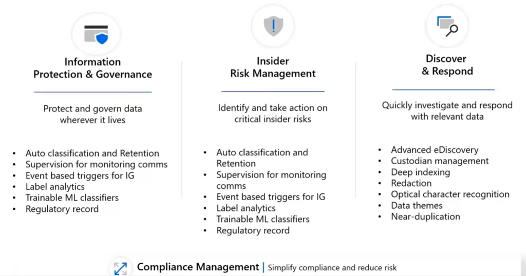 This is a 1-hour session split into the core segments of compliance around the 4 pillars of Info protect/governance + Insider Risk + eDiscovery + Compliance management.