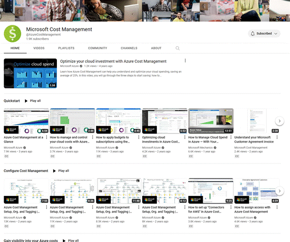 We have a dedicated YouTube channel to allow folks to learn how to use Azure Cost Management.There are over 20+ videos there discussing, “How to control costs”, “how to apply budgets”, “how to optimize your spend”, “how to setup tagging”, how to review your invoice”, etc.