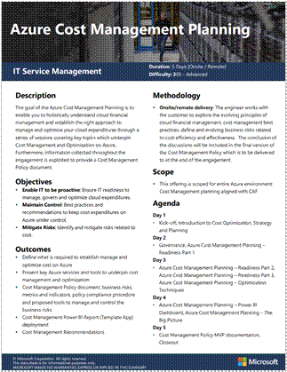 “The goal of the Azure Cost Management Planning is to enable you to holistically understand cloud financial management and establish the right approach to manage and optimize your cloud expenditures through a series of sessions covering key topics which underpin Cost Management and Optimization on Azure. Furthermore, information collected throughout the engagement is exploited to provide a Cost Management Policy document.”