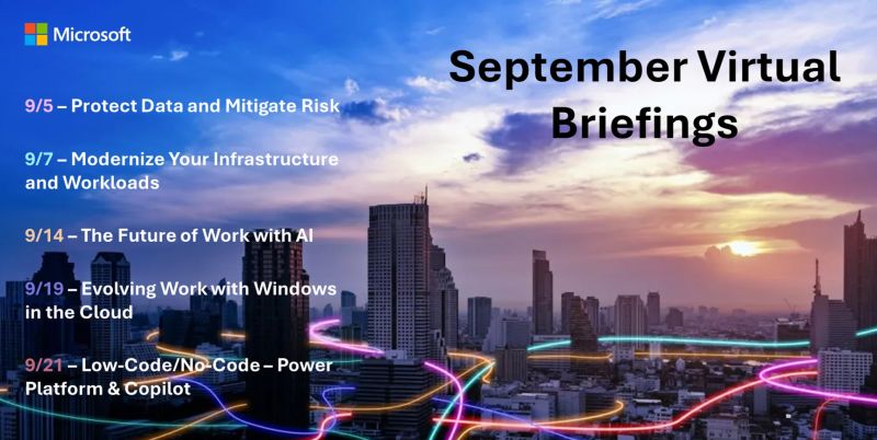 🔒 9/5 – CYBERSECURITY – Protect Data and Mitigate Risk: https://mktoevents.com/Microsoft+Event/405792/157-GQE-382 Learn how to secure data and reduce risks with Microsoft Purview Information Protection and risk mgmt. solutions. Explore how to manage data protection policies across your organization and protect your people and data against cyberthreats.