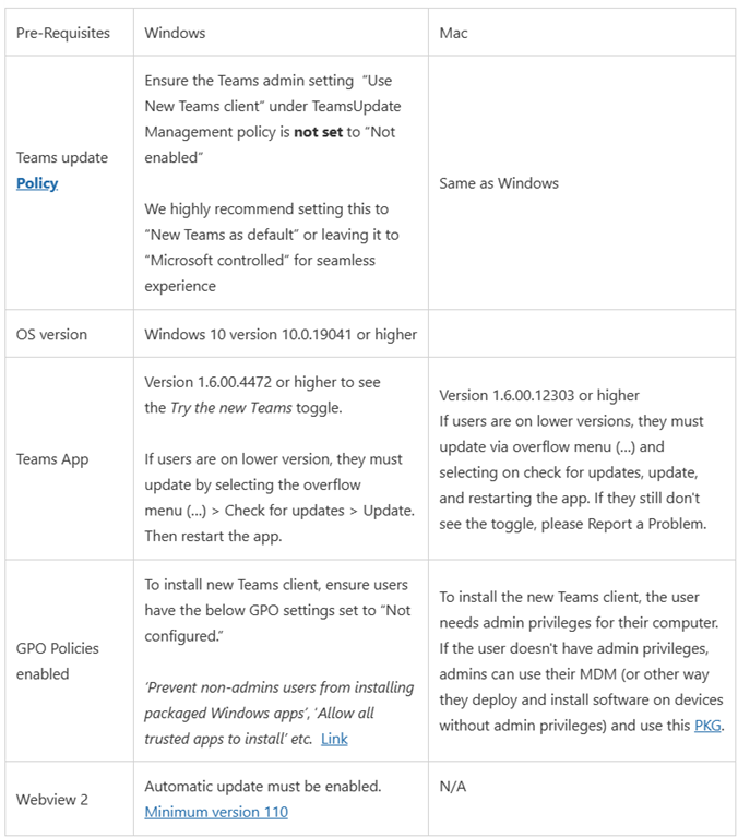 If you haven’t already updated to new Teams yet, review the prerequisites and policy updates for the update to new Teams.