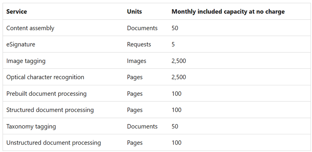 This promotion grants a monthly allocation of credit for 9 services that are part of SharePoint Premium. This includes the items in the table below & as you can see, it’s a fair amount of credit for each service: