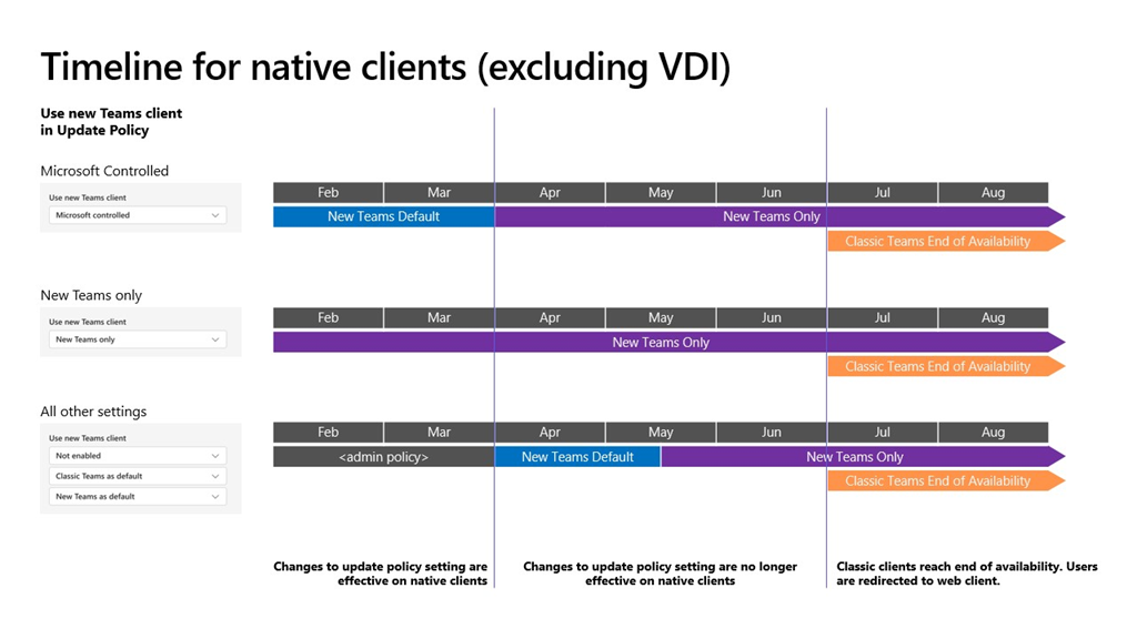 - If you are using the Admin-controlled policies for manage the New Teams client rollout, as outlined in Upgrade to the new Teams using policies, know that these policies will no longer be honored at the start of April, apart from your VDI users, and the following changes will happen: