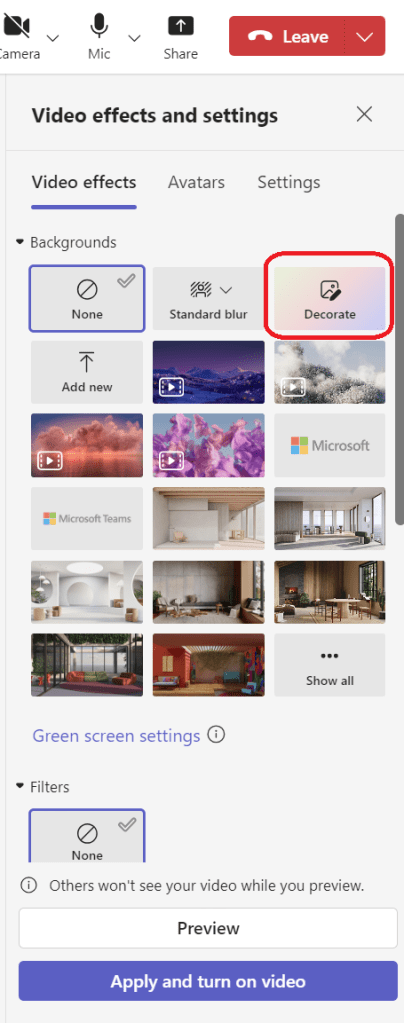 It’s a new button that should show up under “Video effects” if your account has a Teams Premium license. Simply select “Decorate” and apply any number of AI-generated effects: