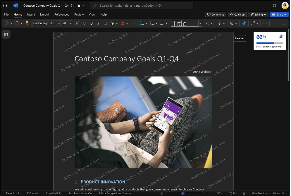 Take a look at the image below: Notice the watermark imprinted on the opened document with the current user’s identity, “jholloway@contoso.com”?