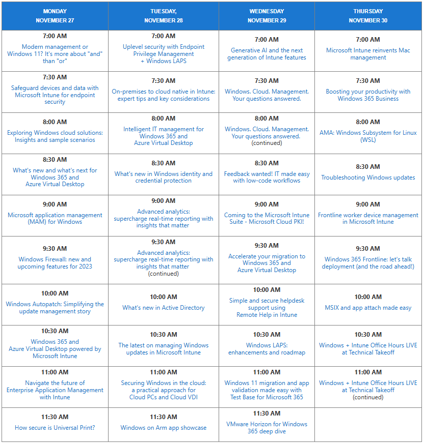 One of the best virtual events we ever did was called the Microsoft Technical Takeoff. It covered so many universally requested & needed topics about desktop infrastructure… Windows, Intune, Azure Virtual Desktop, Window 365, Windows Firewall, Windows Autopatch, Desktop Analytics, PKI… over a 4 day period, it was wonderful.