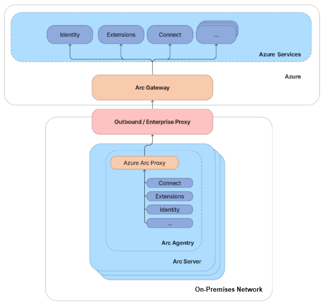 - The Arc Proxy: A new component added to Arc agentry. This component runs as a service called “Azure Arc Proxy” and acts as a forward proxy used by the Azure Arc agents and extensions. No configuration is required on your part for the gateway router. This router is part of Arc core agentry and runs within the context of an Arc-enabled resource.