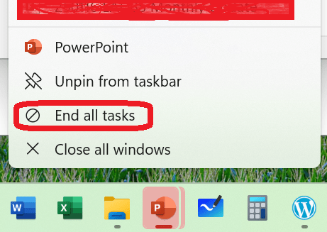 The next time you right click an application in the Windows Taskbar, you should see a new menu option called “End all tasks”.
