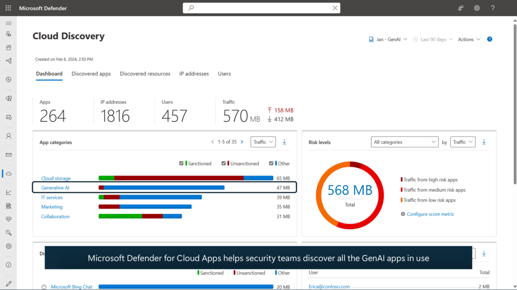 Microsoft Defender for Cloud Apps helps you discover and protect more than 800 generative AI applications, now including DeepSeek. It provides the necessary overview of an app’s usage in your organization, combined with the potential risk that the app poses for your organization. In fact, it profiles more than 90 separate risk attributes for each application in the Cloud App Catalog so you can make informed choices in a unified experience.
