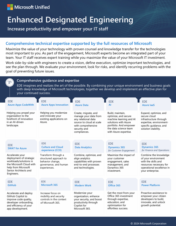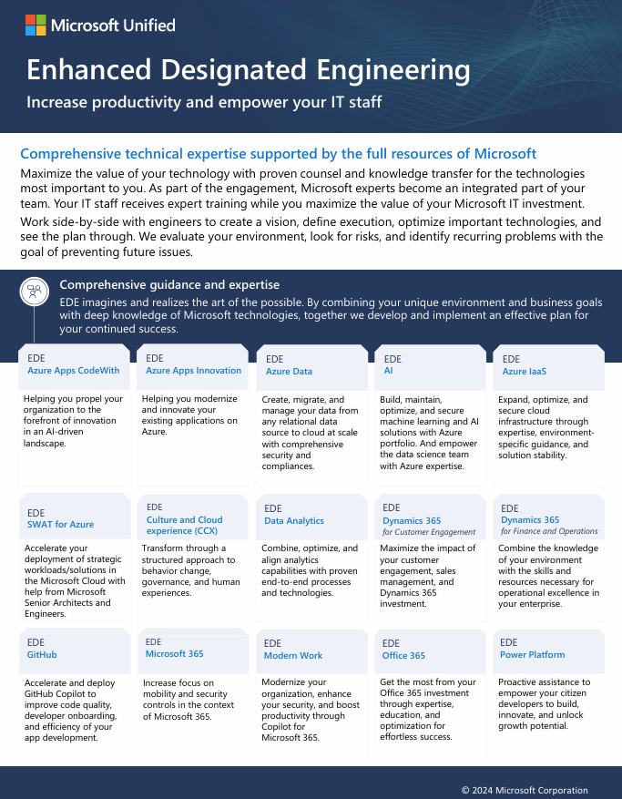 Provides superior engineering engagement, empowering you to escalate critical issues directly to Microsoft Security engineering teams. Our experts ensure your Security products are working effectively to protect you against the modern threat landscape. - Unified Enhanced Response
