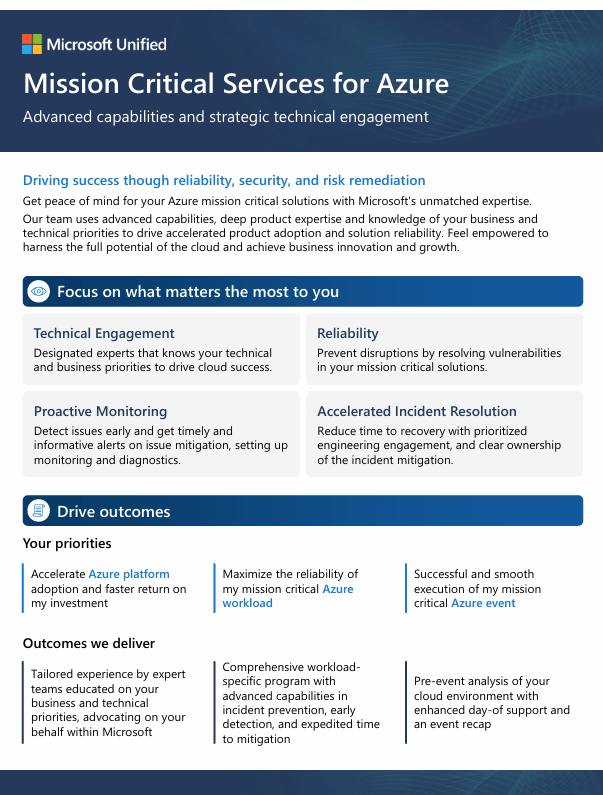Partners with you to ensure your most significant Azure products, workloads, and events run smoothly. During critical incidents, this experience expedites recovery and ensures business continuity. - Mission Critical Services for Microsoft Security Cloud