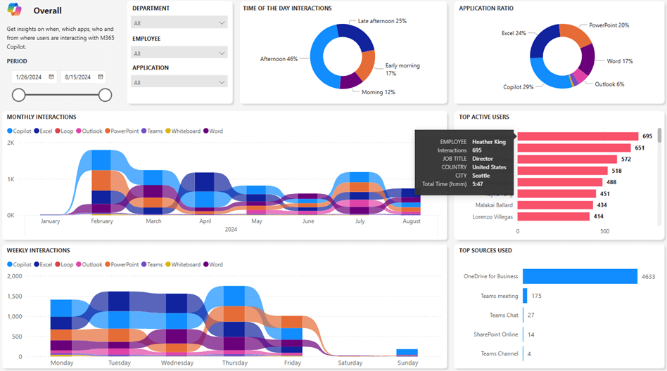 This report uses data from the Purview Audit log and Entra ID exports that get saved into 2 CSV files. The first csv file is storing Copilot Interaction events and other csv is exporting user details (Display Name, UPN, Position, City, Country) for users that have M365 copilot license assigned.