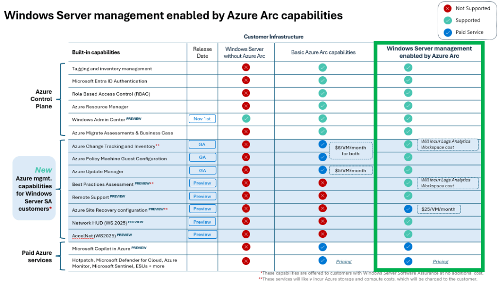Windows Server management enabled by Azure Arc provides a single pane of glass for 20+ Azure services at no additional cost specifically for customers using either “Windows Server 2025 cores with Software Assurance” or “Windows Server 2025 enrolled in pay-as-you-go”.