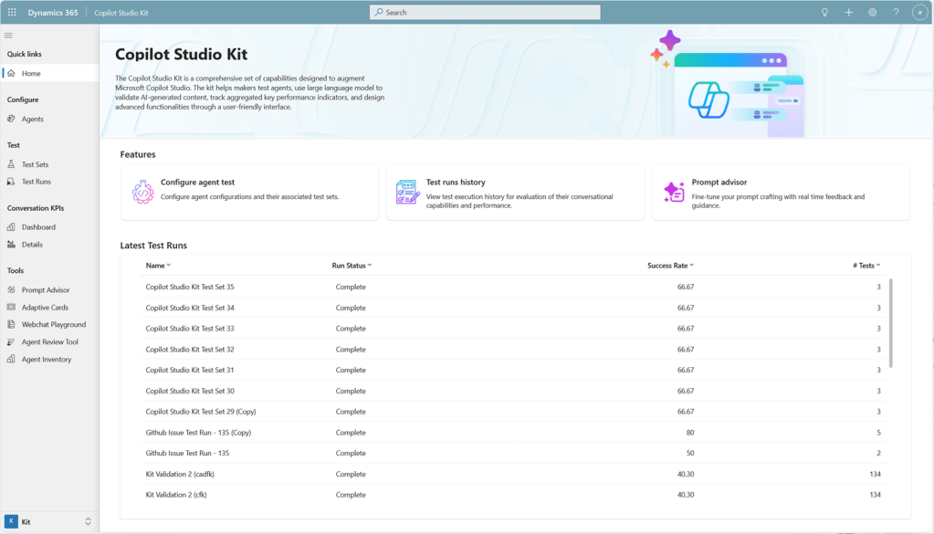The Power CAT Copilot Studio Kit is a comprehensive set of capabilities designed to augment Microsoft Copilot Studio. The kit helps makers develop and test custom agents, use large language model to validate AI-generated content, optimize prompts, and track aggregated key performance indicators of their custom agents.