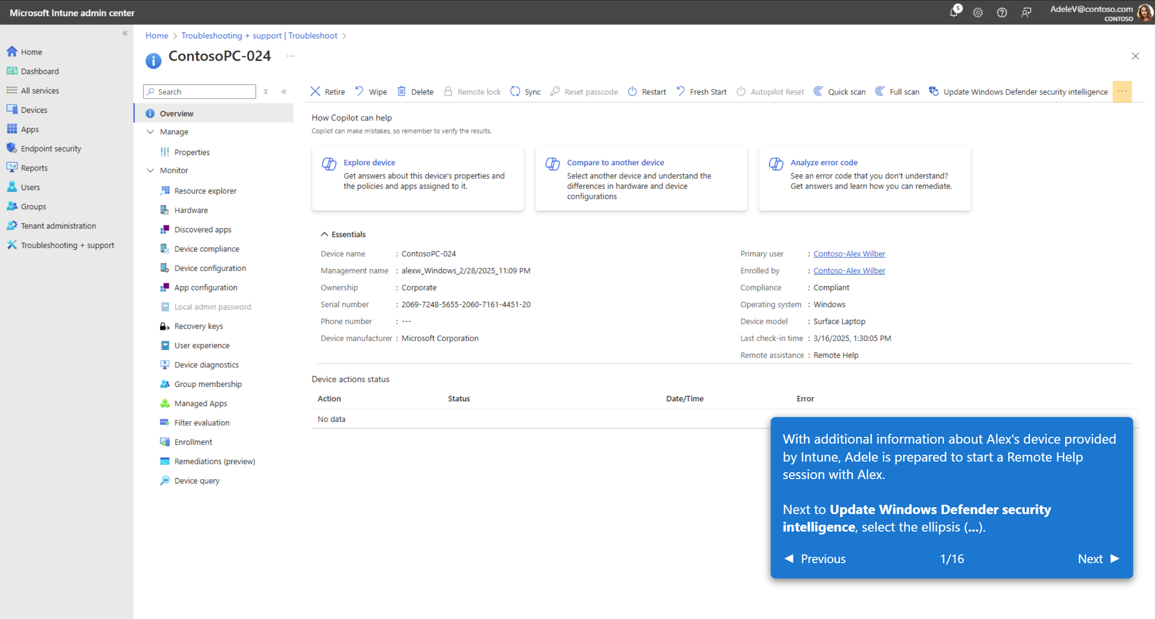 The Intune Remote Help interactive demo walks you through scenarios step-by-step with interactive annotations and navigation controls. The demo reviews: