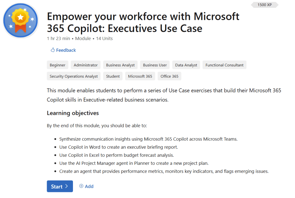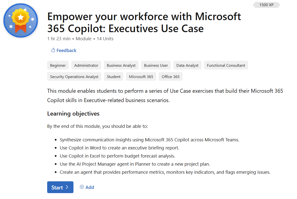 Try it at: Empower your Workforce with Microsoft 365 Copilot: Executives Use Case – Training | Microsoft Learn